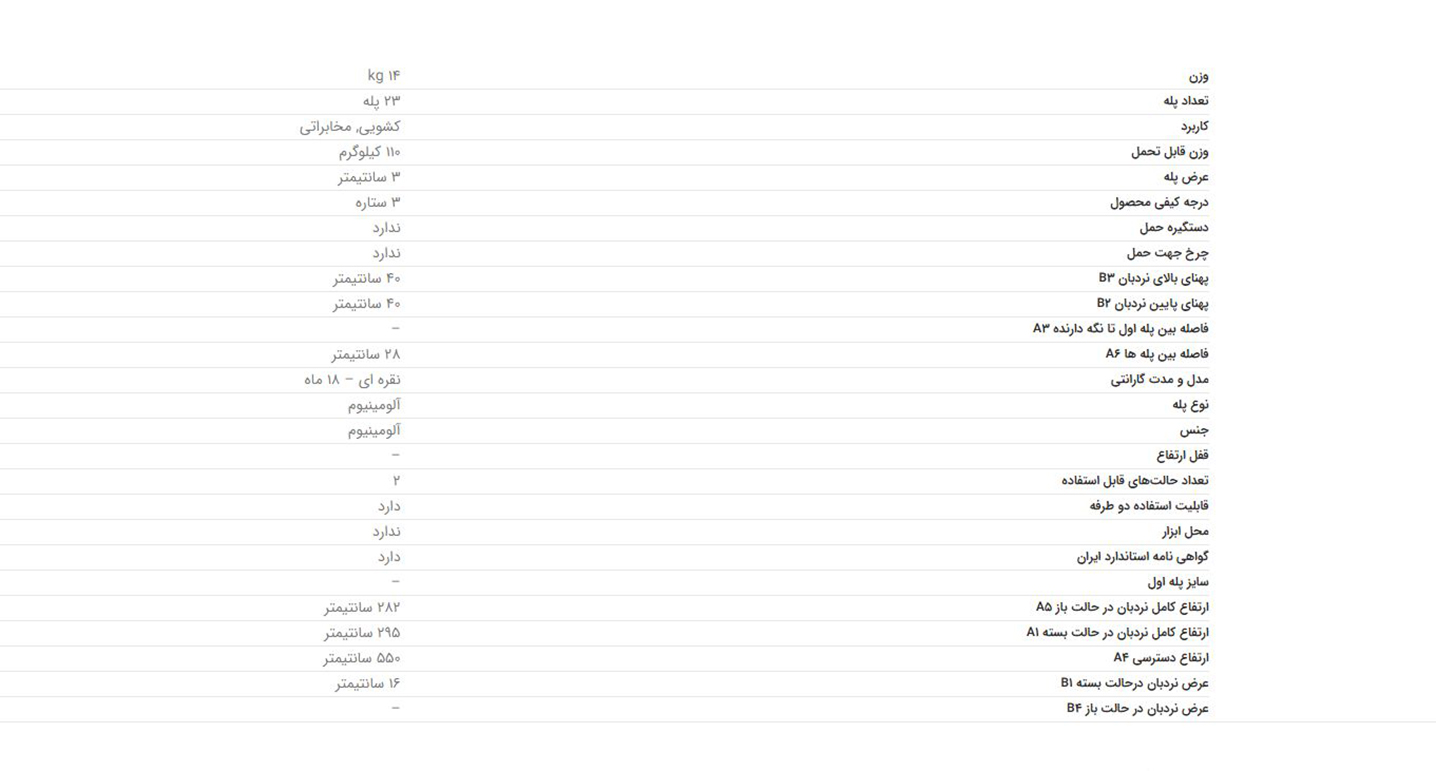 این نردبان بسیار کاربردی است و همزمان میتوانید از دو طرف آن استفاده کنید. این نردبان از آلومینیوم تولید شده است و مقاومت زیادی دارد. از نردبان تک صنعت کاربر راحت میتواند استفاده کند و قابلیت تحمل وزن تا 110 کیلوگرم دارد. نوع پلههای این نردبان چندضلعی بوده و با استفاده از آن میتوانید کارهای صنعتی خود را بهراحتی انجام دهید. با استفاده از قفل ارتفاع خیالتان از امنیت این نردبان راحت خواهد بود و بهراحتی میتوانید از آن استفاده کنید